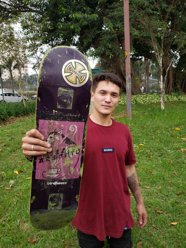 Para sonhar alto, bem alto, gostaria de ter algum manobrado pelo Jason Lee ou pelo Gino (Iannucci). Mas tem caras que são mais próximos e se eu fosse atrás, eu conseguiria ter, tipo o (Pedro) Iti, que acho muito dahora, o Pedro Biagio, o Wilton (Souza)… Tem muito cara daqui do Brasil que eu gostaria de ter o shape e é só questão de trocar ideia e encontrar o cara para pegar o shape. Com esses nomes eu ficaria feliz.