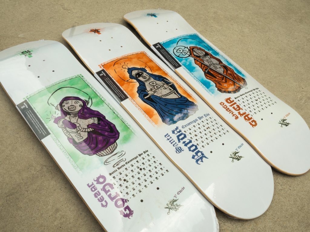 Para mim a série Santa Borda foi um divisor de águas na história dos nossos gráficos. A série tinha 4 shapes com seus Santos orando para que as bordas escorregassem, junto com o shape também vinha uma vela de brinde. Até então, fazíamos artes mais conceituais, mais preocupados em construir uma identidade gráfica sofisticada. Ficou claro pra mim que seria um caminho legal para ir evoluindo, com gráficos que buscassem uma identificação maior e mais direta com a forma como vemos o skate e toda sua cultura.
